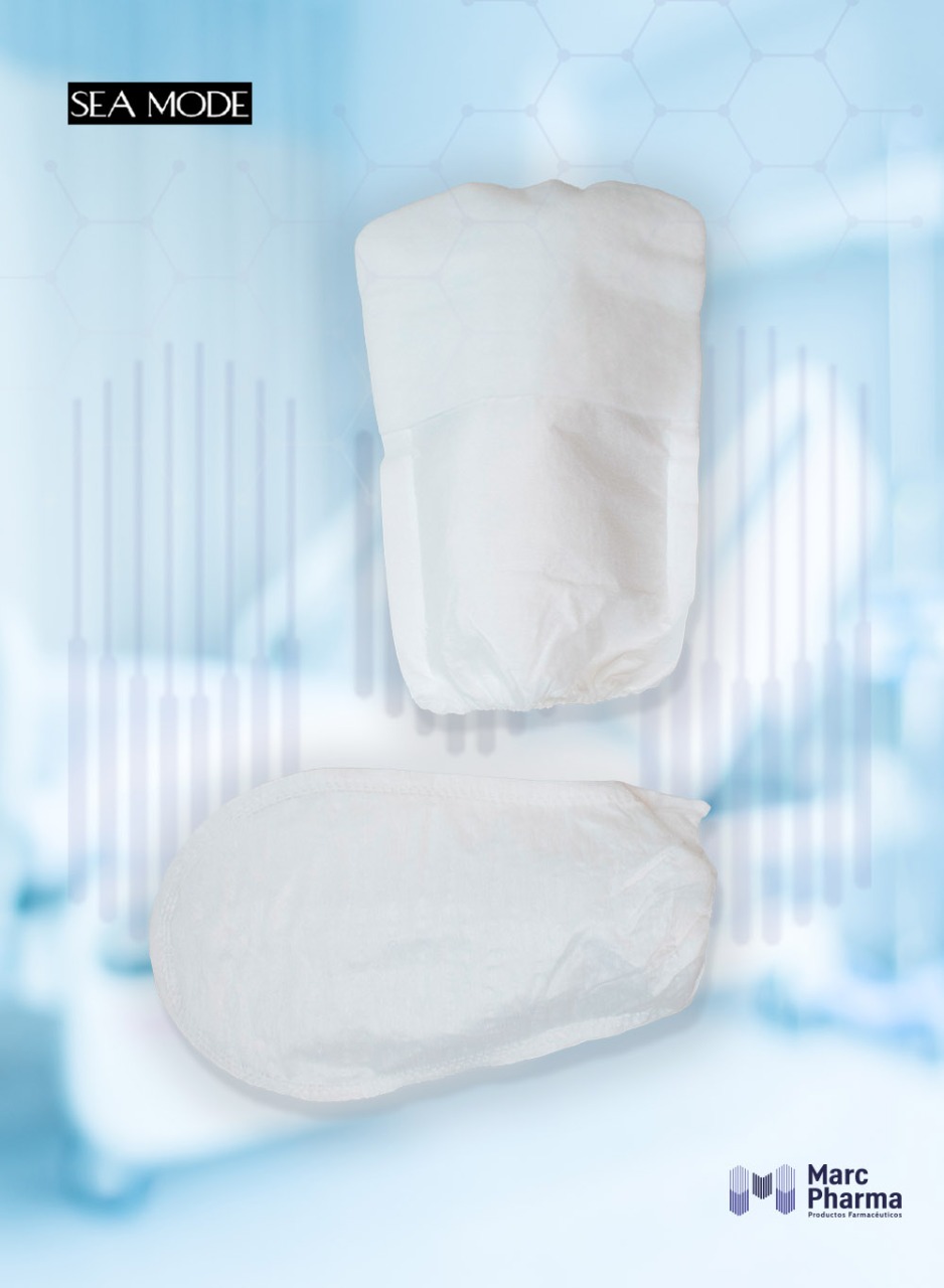 Manopla de viscosa plastificada con esponja pre enjabonada, clorhexidina y elástico para lavado o limpieza del cuerpo de los pacientes momentáneamente inmóviles por causa de una patología, para los incontinentes seniles y para los recién nacidos.